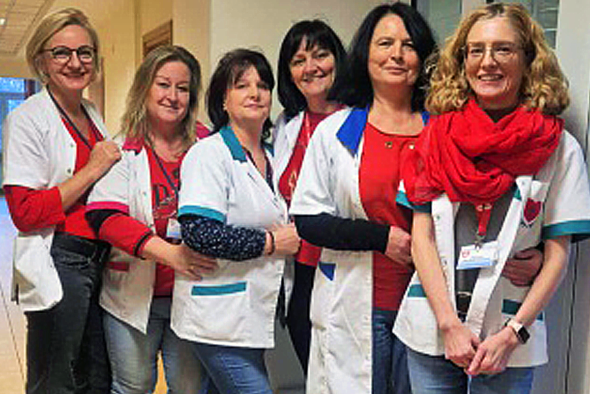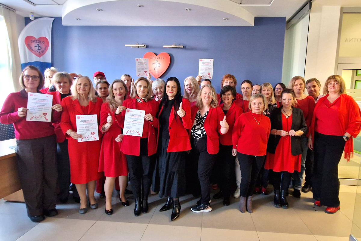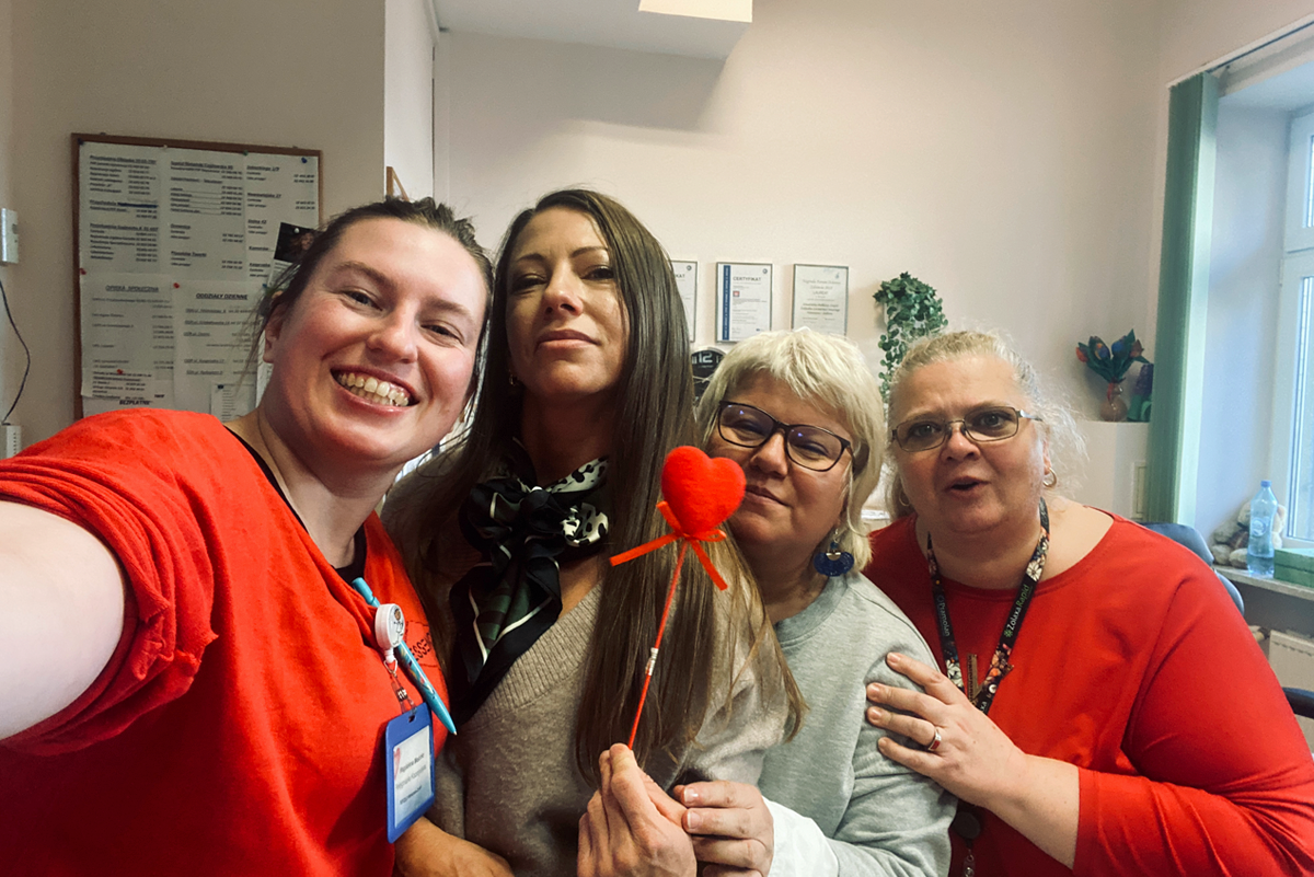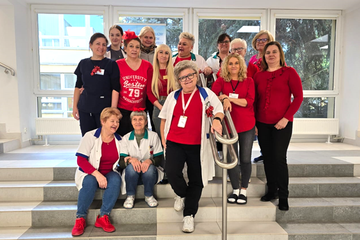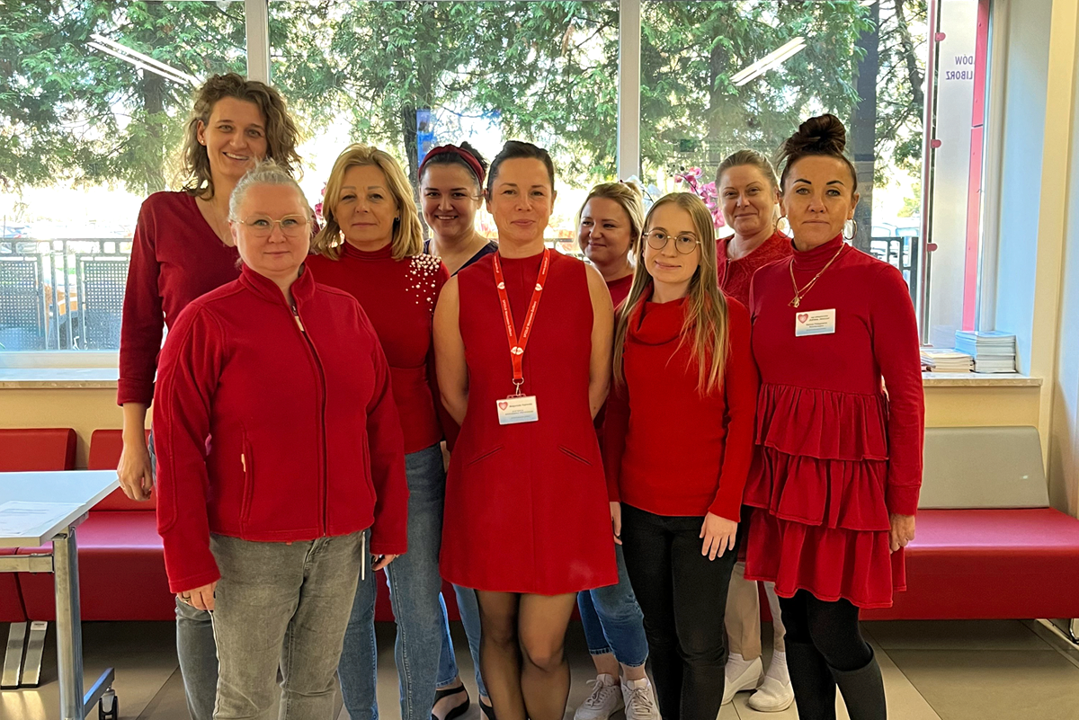 Pracownicy przychodni przy ulicy Klaudyny ubrani na czerwono.
