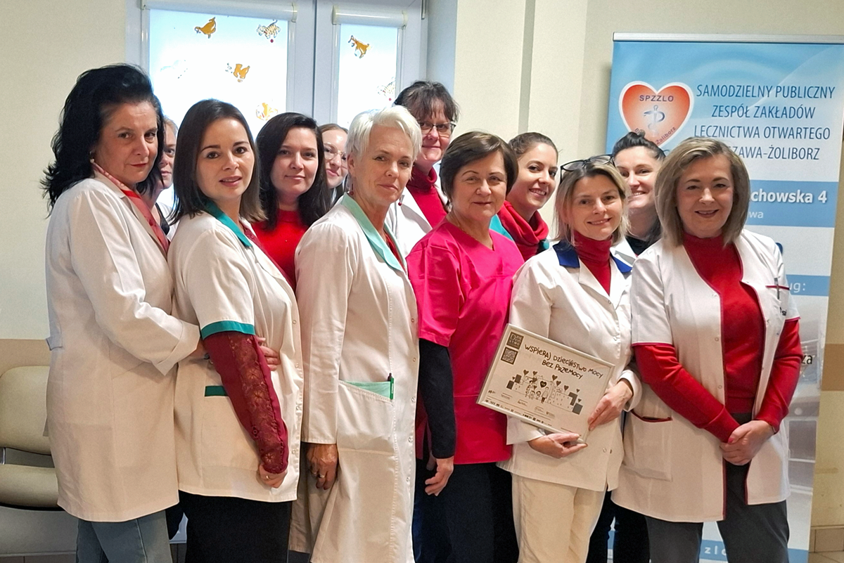 Dyrekcja i pracownicy ubrani na czerwono na tle logo SPZZLO Warszawa Żoliborz-Bielany.