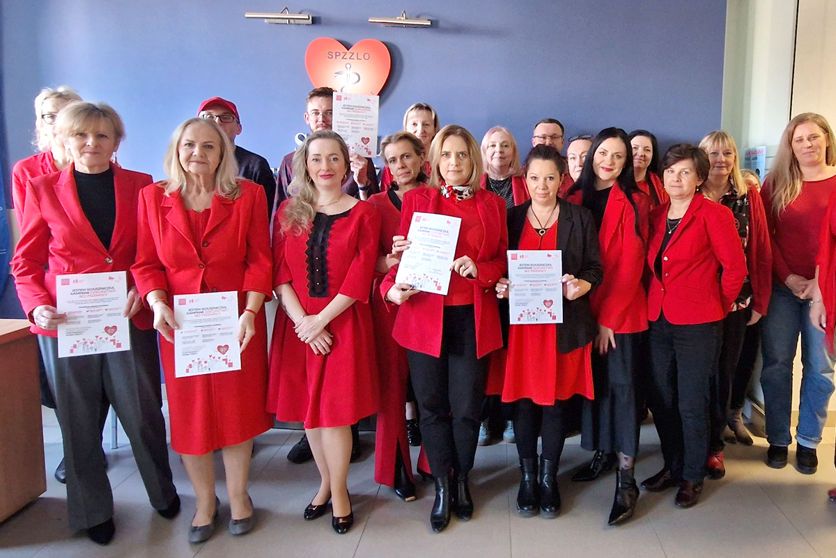Pracownicy przychodni przy ulicy Sieciechowskiej ubrani na czerwono.